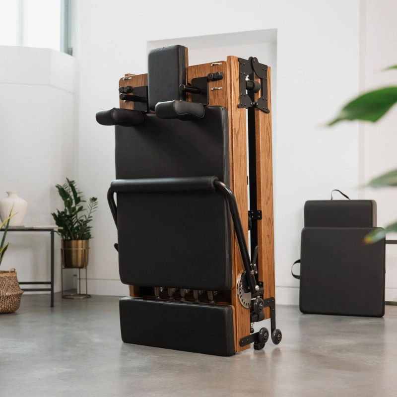 這是一款結合緊湊設計與工作室品質的折疊式皮拉提斯床。採用高級楓木/橡木製作,擁有極其順暢且安靜的滑動床板,配備五段彈簧與四段腳桿,適合各種訓練等級。